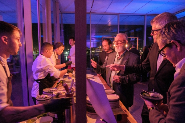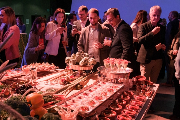 La bienvenida fue un espectáculo en sí mismo. Gourmet Catering & Eventos transformó el acceso a Veles e Vents en un recorrido sensorial por la despensa mediterránea, un homenaje al origen y al producto. En el hall presidía un imponente olivo que evocaba la riqueza del territorio y marcaba el inicio de la experiencia. A su alrededor, el equipo desplegó una puesta en escena inspirada en la huerta, el mar y la Albufera, combinando aromas, texturas y colores en un ambiente elegante y evocador que dio paso a una noche donde el territorio fue protagonista.
